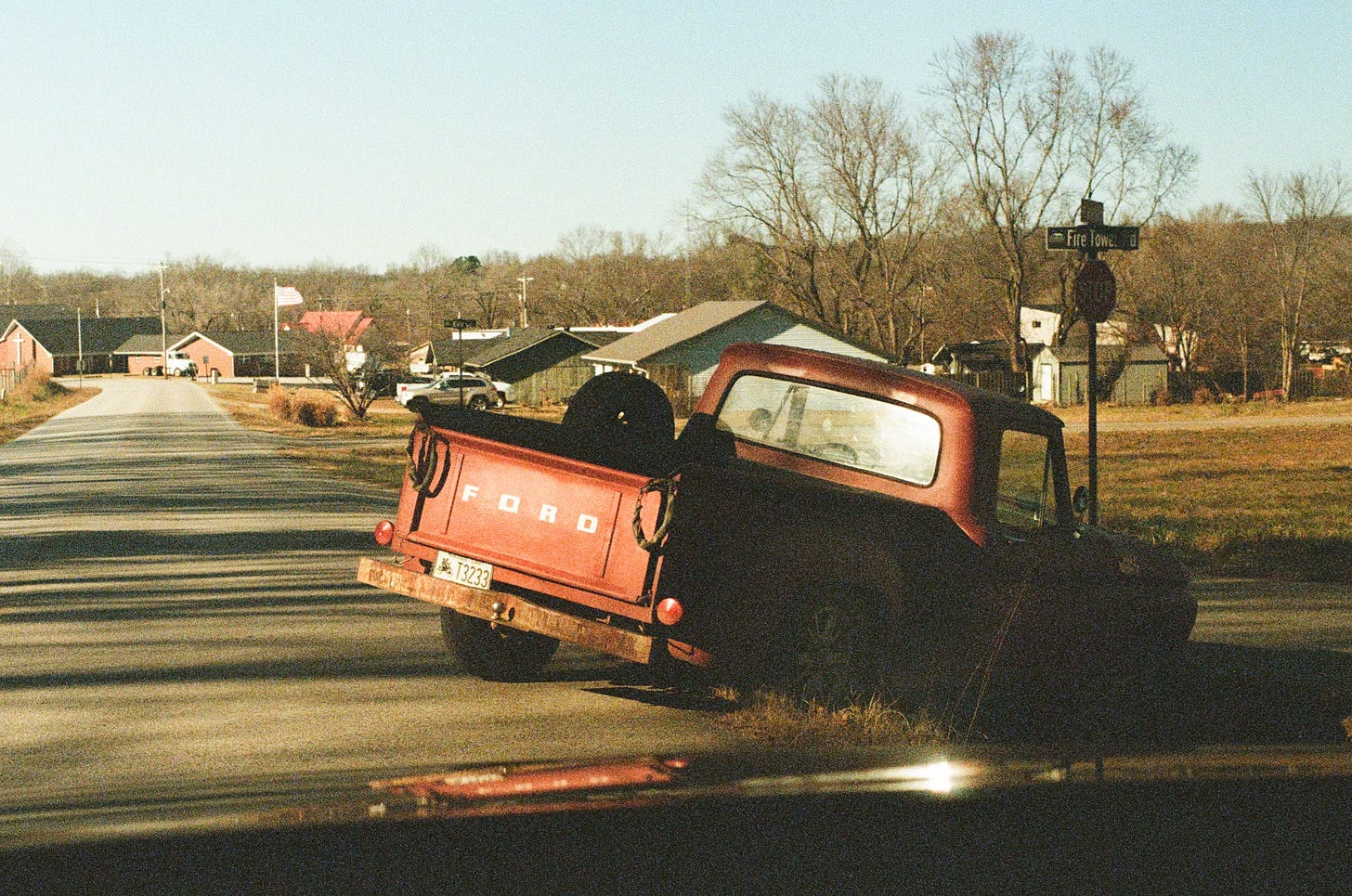 I look at the photo of the old red Ford slumped into the ditch. When I saw the old man standing by his truck, I stopped and asked whether he needed a lift somewhere. He directed me to the community center, where a group of his friends were gathered for a memorial service. There’ll be someone there who can winch me out, he said.
